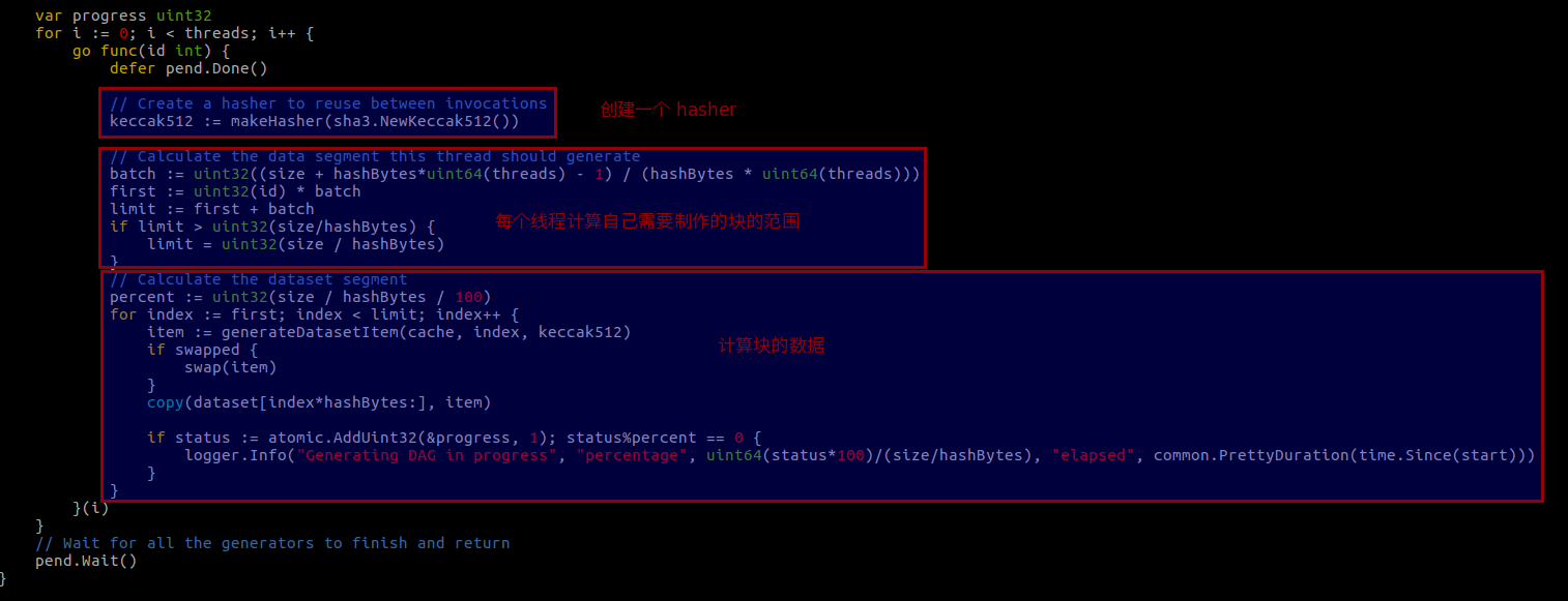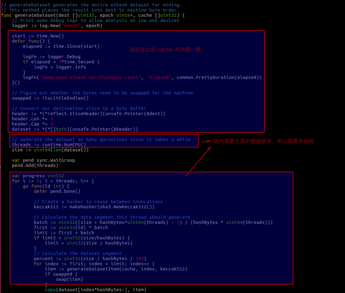 接下来看看 dataset 生成的代码,generateDataset (consensus/ethash/algorithm.go)