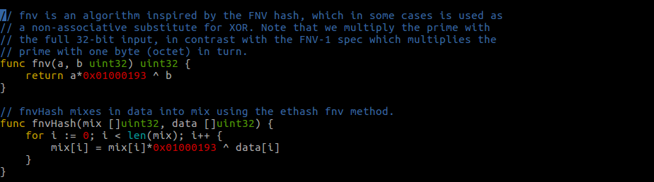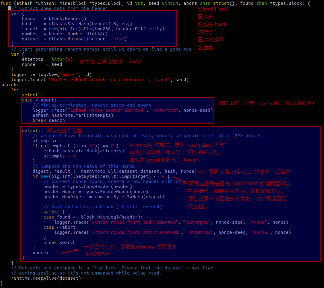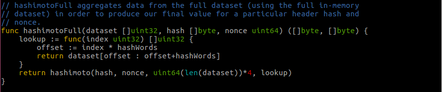 其中的 hashimotoFull,这个名字很熟悉了,前面介绍过 hashimoto 的算法,这里的算法实现和之前的有所区别,主要是这里使用的数据集不再是整个区块链,而是叫做 DAG 的数据集,这个后面再说。