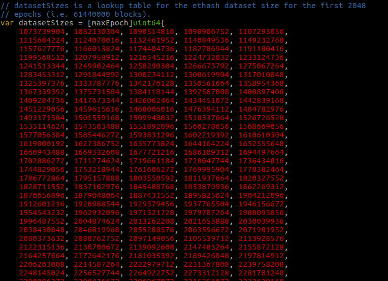 func datasetSize(block uint64) uint64 { epoch := int(block / epochLength) if epoch < maxEpoch { return datasetSizes[epoch] } return calcDatasetSize(epoch) // 超过 2048 epoch,用这个函数计算 }