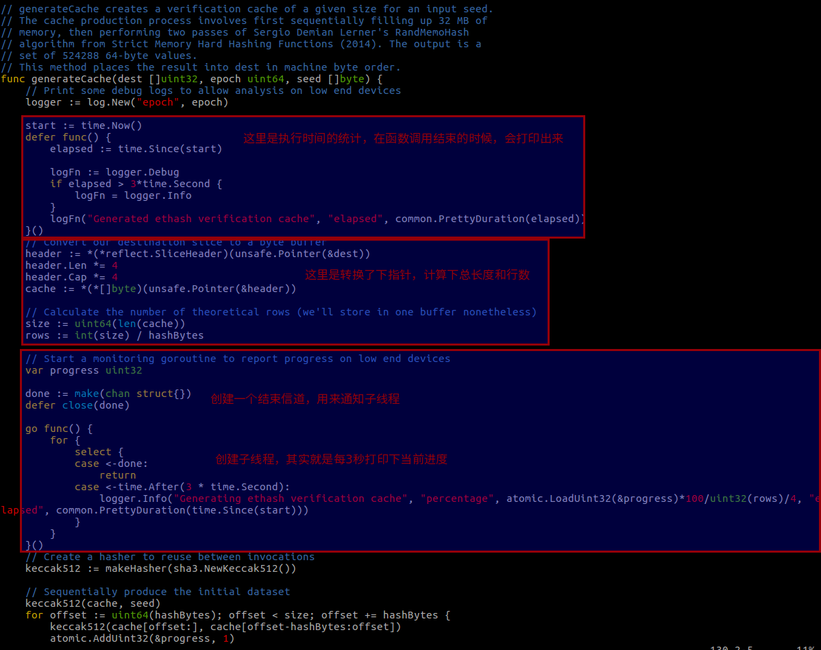 这些说完了,我们先看下生成 cache 的代码,generateCache (consensus/ethash/algorithm.go)