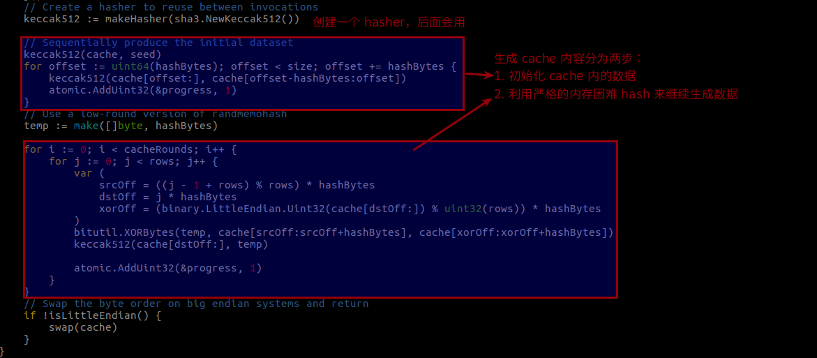 ethash 与传统 hashimoto 不同的地方,主要是使用了特殊的数据集 DAG,而生成 DAG 需要先生成 cache。