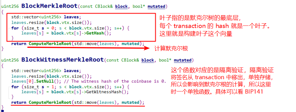 默克尔树相关代码都在 merkle.cpp 中,BlockMerkleRoot 和 BlockWitnessMerkleRoot 是两个入口函数。