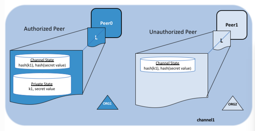 - 私密数据的哈希。哈希数据会被背书、排序并写入到每个(注意是每个)节点的账本里,用来证明数据的有效性,便于以后的查账。