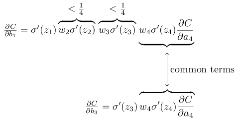 由于我们使用的是标准正态分布的方式初始化变量,所以一般情况下(68.2%), |w|<1,σ′(z)<1/4,所以|wjσ′(zj)|<1/4